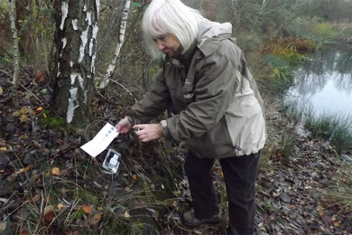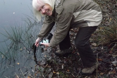 Es wurden gemessen: um 09:15 ca. 86% Sauerstoffsättigung, um 15:15 ca. 95% Sauerstoffsättigung. Die Zunahme der Konzentration an gelöstem Sauerstoff lag nicht nur an einer leichten Erwärumg des Wassers von 4,10C auf 4,70C im Laufe des Tages (wärmeres Wasser kann weniger Sauerstoff lösen und ist daher eher gesättigt). Auch der absolute Sauerstoffgehalt stieg während der hellen Tagesstunden von 11,4 mg/l auf 12,2 mg/l. Das ist um so erstaunlicher, weil es am gesamten Tag neblig-trüb war.