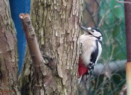 Immer, wenn man nun im Winter die Schrebergarten-Anlage betritt, sollte man sich vorsichtig dem Garten nähern. Meistens fliegen dort mindestens 8-10 Vögel herum und die Luft ist erfüllt vom Gezwitscher der Meisen. Heute hat uns dann ein Buntspecht-Paar überraschend, das sich lange zum Fressen im alten Pflaumenbaum aufgehalten hat.