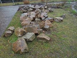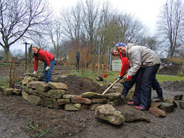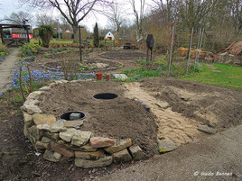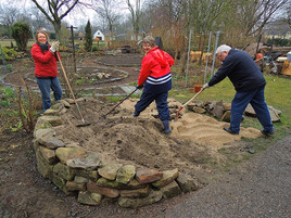 Mit Schneeregen und Temperaturen knapp über Null schaute der Winter noch einmal vorbei. Davon ließen sich die fünf fleißigen NABU Gärtner jedoch nicht von ihrem heutigen Biotop- Projekt abhalten. Auf die vorbereitete Gründung aus 20 cm Schotter bauten wir bis zum Mittag aus Ruhrsandsteinen eine halbrunde Trockenmauer auf. Nach Süden ausgerichtet und mit Rheinsand drainiert und abgemagert soll dieser Bereich als Sonnenfalle fungieren. Wärme und Trockenheit liebenden Pflanzen und Tieren werden hier einen idealen Lebensraum vorfinden. Im Mauerfuß wurden Verstecknischen für Amphibien und Reptilien eingebaut.
