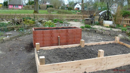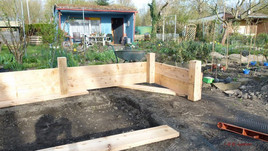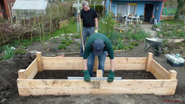 Auch im NABU-Garten sollen in diesem Jahr zwei Schau-Beete in unterschiedlicher Ausführung aufgestellt werden. Hierzu trafen sich am Samstag, den 11.April 2015 Raimund, Hans-Werner und Brigitte im Garten. Zur Aufbereitung guter Gartenerde war der Boden an der geplanten Stelle schon seit Herbst unberührt geblieben. Eine dicke Mulchschicht aus Laub und den Resten der letztjährigen Bepflanzung hat dort locker-krümelige frische Gartenerde entstehen lassen. Für das wadenhohe Beet wurde der Boden gut spatentief ausgehoben, um dort zuunterst einen engmaschigen Draht zur Abwehr von Wühlmäusen und Kaninchen einzulegen. Hans-Werner und Raimund haben dann gemeinsam dieses Beet aus unbehandeltem Lärchenholz zusammengeschraubt und ausgerichtet.