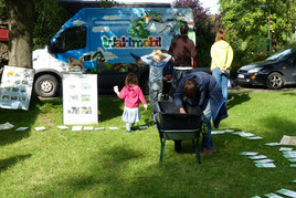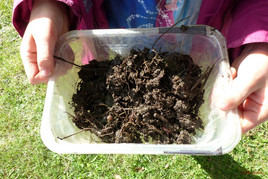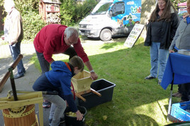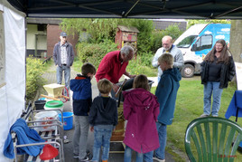 Die Waldpädagogin Andrea Hirsch war mit dem Waldmobil vor Ort. Gemeinsam mit Klaus-Dieter Lemm hatte sie eine Schubkarre mit frischen Kompost von der Kompostranch der Gartenanlage geholt. Die Kinder haben mit sehr viel Interesse und Spaß darin die vielen Regenwürmer, Tausendfüßer und Asseln gesucht und unter dem Mikroskop angeschaut. Immer wieder haben sie sich von Andrea sagen lassen, welche es sind und welche wichtige Funktion sie im Boden haben. So haben sie spielend gelernt, den Gartenboden wertzuschätzen.