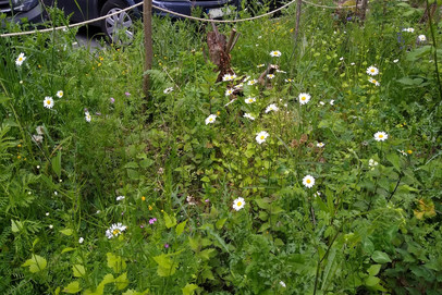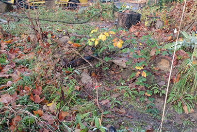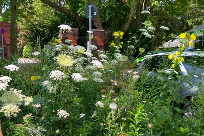 Natürlich gehören zu einem insektenfreundlichen Garten auch diverse blühende Pflanzen in Form von einjährigen Blütenpflanzen bis hin zu mehrjährigen Stauden als Nahrungsquellen für Insekten und deren Larven. Jetzt im Frühwinter sind nur noch die verblühten Reste zu sehen. Sie bleiben bewusst bis zum Spätwinter / Frühjahr im Beet um den Boden zu schützen und zu wärmen und um in der unteren Staudenschicht den überwinternden Insekten Schutz zu bieten. Außerdem ist es im Prinzip eine Flächenkompostierung. Denn das liegengebliebene Laub und die verwelkten Pflanzenreste können so auch im Winter von den Bodenorganismen in eine Humusschicht umgewandelt werden. Im zeitigen Frühjahr werden die übriggebliebenen Reste vorsichtig abgeharkt und zum Kompost gegeben. Auf den freigelegten Flächen erwärmt sich der Boden dann schneller und die überwinternden Stauden und das heruntergefallene Saatgut haben Platz um neu auszutreiben [Foto 7+8]. Andreas Peters hat zum Vergleich einige Fotos des Sommers 2023 zur Verfügung gestellt, um die blühende Pflanzenvielfalt zu dokumentieren [Fotos 9-12]. Es handelt sich in erster Linie um Wildpflanzen, aber auch einige Kulturpflanzen. Hier ein kleiner Auszug aus seiner Pflanzenliste, die wir zum Großteil anhand der verwelkten Pflanzen bestätigen konnten: Gemeiner Frauenmantel Alchemilla vulgaris / Knoblauchsrauke Alliaria petiolata / Färberkamille Anthemis tinctoria / Gemeine Akelei Aquilegia spec. / Gewöhnlicher Beifuß Artemisia vulgaris / Wiesen-Schaumkraut Cardamine pratensis / Berg-Flockenblume Centaurea montana / Kratzdisteln Cirsium spec. / Wilde Möhre Daucus carota / Gewöhnlicher Wasserdost Eupatorium cannabinum / Kletten-Labkraut Galium aparine / Waldmeister Galium odoratum / Kompass-Lattich Lactuca serriola / Wiesen-Margerite Leucanthemum vulgare / Blutweiderich Lythrum salicaria / Moschusmalve Malva moschata / Hopfenklee Medicago lupulina / Zitronenmelisse Melissa officinalis / Wald-Vergissmeinnicht Myosotis spec. / Dost bzw. Oregano Origanum vulgare / Gemeine Nachtkerze Oenothera biennis / Kleine Braunelle Prunella vulgaris / Geflecktes Lungenkraut Pulmonaria officinalis / Kriechender Hahnenfuß Ranunculus repens / Apfelrose Rosa villosa / Wald-Ziest Stachys sylvatica / Huflattich Tussilago farfara / Echter Baldrian Valeriana officinalis / Schwarze Königskerze Verbascum nigrum / Gewöhnlicher Hornklee Lotus corniculatus / Brennnesseln.