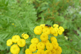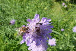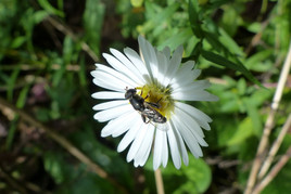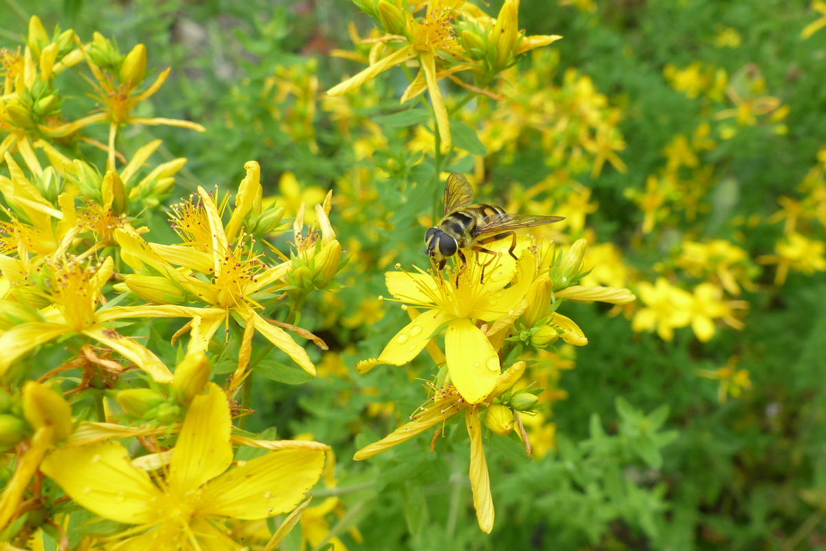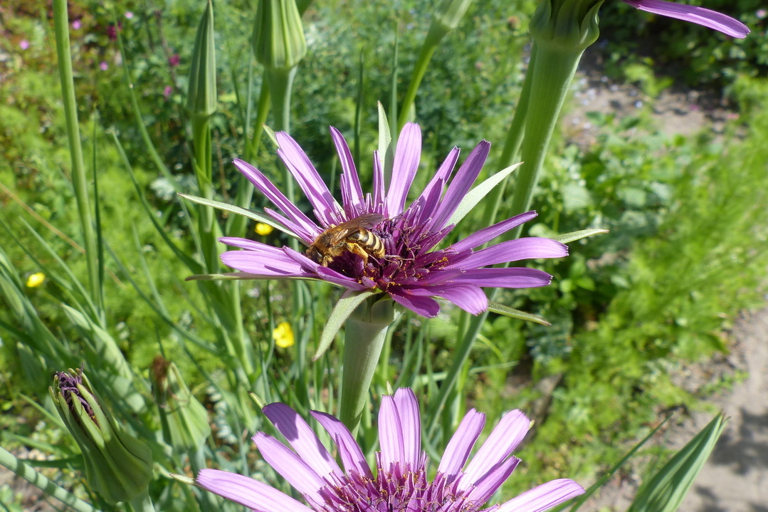 Dennoch soll hier noch kurz festgestellt werden, dass Taubenskabiose (14 Insekten-Arten = IA), Dost (12 IA), Tüpfel-Johanniskraut (12 IA), Wiesen-Witwenblume (9 IA), Lungenkraut (8 IA), Herbst-Aster (8 IA) und Wiesen-Flockenblume (7 IA) zu den in diesen beiden Gärten am meisten angeflogenen Blütenpflanzen gehörten. Aufgrund der jeweils bekannten gärtnerischen Herkunft für die Pflanzen in diesen beiden Gärten kann hier festgestellt werden, dass es sich um nur sehr gering durch Kultur veränderte oder nur vermehrte (Wiesen-Witwenblume, Tüpfel-Johanniskraut und Tauben-Skabiose) Wildformen handelt. Festzustellen war auch, dass die stark züchterisch bearbeiteten Zierpflanzen wie die Kokardenblume (Ursprung N-Amerika), Bienen-Kugeldistel (SO-Europa), Nachtkerze (N-Amerika), Schuppenkopf (Kaukasus/N-Türkei), Ballonblume (O-Asien), Rhododendron (nördliche Hemisphäre) in erster Linie von den Imker-Honigbienen, einigen Hummel-Arten und einigen Schwebfliegen-Arten angeflogen wurden. Diese Insekten-Arten dürfen sicherlich als Kulturbegleiter der Gärten angesprochen werden. Hinzugezählt werden dürfte hierzu sicherlich auch die Gehörnte Mauerbiene, die mittlerweile durch ihre sehr frühe Flugzeit auf die in Gärten frühblühenden Zierpflanzen angewiesen ist.