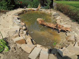 Mit Ihnen wurde der Sand in den einzelnen Wasserzonen befestigt und später die Folie am Rand des Teiches abgedeckt. Abschließend freuten wir uns bei Tee, Kaffee und einer Brotzeit über unser neues Biotop. Bachbunge, Igelkolben, Krebsschere und andere Wasserpflanzen wurden später ebenfalls eigesetzt. Schlammschnecken aus meinem Gartenteich sollen helfen möglichst schnell ein biologisches Gleichgewicht im Teich herzustellen.