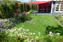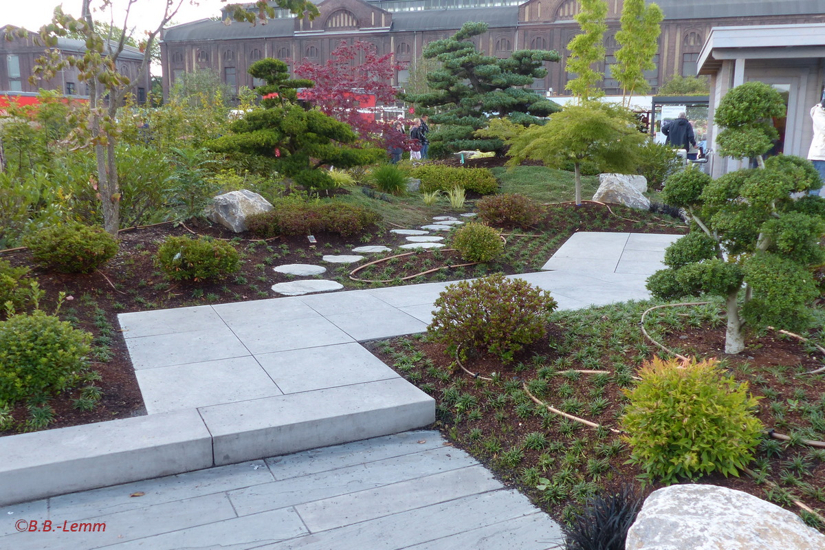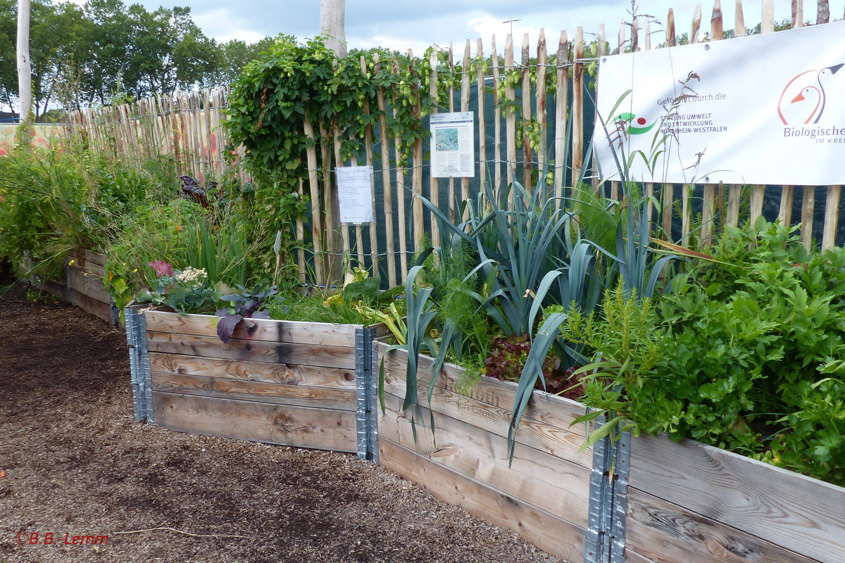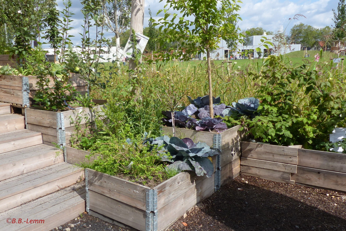 Die LaGa zeigt Ausstellergärten der Grünen Wirtschaft (GaLa-Bau, Baumschulen, Gärtner, etc.) der Umgebung. Ein Planungsbüro hat nach einer entsprechenden Ausschreibung ein künstlerisches Gesamtkonzept geschaffen. Außerdem wurden neben den mindestens 40.000 Zwiebeln und Stauden auch 800 Bäume gepflanzt, die später bleiben. Da diese Bäume innerhalb der Stadt einen schwierigen Standort haben, wurden keine sogenannten heimischen Bäume gewählt. Heimische Waldbäume, Gehölze und Gräser wie Eichen und Buchen sind an ein atlantisches Klima mit Regenfällen an eher feuchten Standorten gewöhnt. Eine Innenstadt auf entwässerten Standorten bietet aber nur kontinentales, trockenes Steppenklima. Es wurden also entsprechend Bäume aus kontinentalem Steppenklima wie Hopfenbuchen, Purpur-Erlen, Blumeneschen gepflanzt. Der gärtnerische Teil der LaGa zeigt Ausstellergärten der GaLa-Bauer (Foto 8-12), der Friedhofsgärtner (Foto 13), der Baumschulen sowie der NUA und Naturgarten.org. mit einem Stand zu naturnahem und urbanem Gärtnern. Interessanterweise haben die Baumschulen und nicht die GaLa-Bauer einen Bereich aufgebaut, in dem acht Beispiele für sinnvoll bepflanzte Vorgärten gezeigt werden (Foto 14-16). Der „typische“ Kleingarten war ebenfalls zu sehen (Foto 17-18).