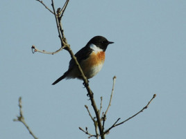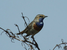 Baumfalke,Schwarzkehlchen, auch mehrere singende Blaukehlchen nahe einem Beobachtungsstand.