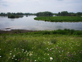 Im Verlauf der weiteren Fahrt entlang dem mit bunten Wiesenblumen bewachsenen Rheindeich - gute Beobachtungsmöglichkeiten an den Einbuchtungen und angrenzenden Feuchtgebieten bei Kaliwaal,an der Bisonbaii und bei Gröenlanden für die zahlreiche Wiesen -und Watvögel, Möwen, Graugänse, Graureiher und Löffler.