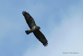 An der Schleuse Herbede, die wir passieren mussten, strömte das Wasser kleine, mit Felsen und etwas Vegetation bestückte Staustufen hinab, an denen bei günstigem Wasserstand die Wasseramsel auf Beutefang geht. Im Verlauf der Fahrt ging es an der Burgruine Hardenstein und an der Zeche Nachtigall vorbei, bis die Fähre schließlich an der Uferstraße nördlich von Bommern, Witten umkehrte. Genau da zeigte sich neben einem Mäusebussard auch ein einzelner adulter Fischadler über der Landschaft.