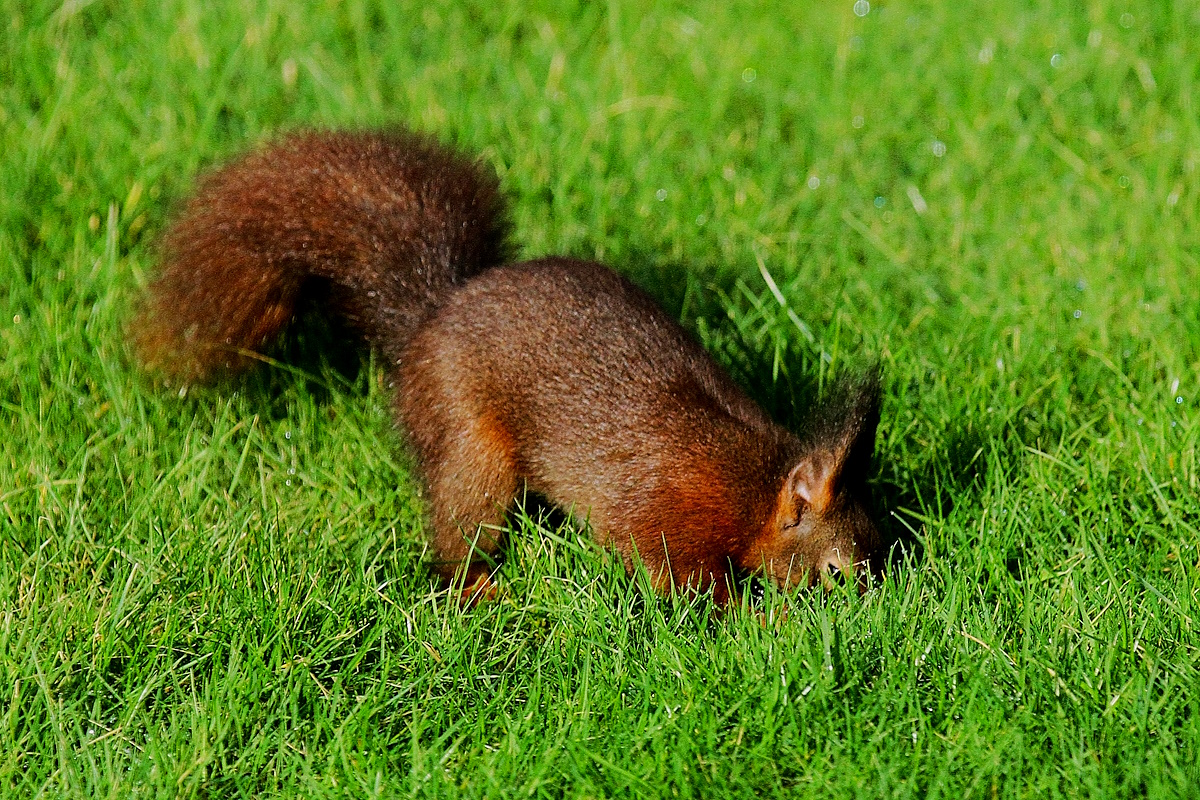 Der rote Kobold Eichhörnchen hat seinen Kobel im nahen Wald verlassen und sucht nach verstecktem Fressvorrat in der Gartenwiese. Nicht selten wird es dabei vom Tausendsassa Buntspecht beobachtet und gleichzeitig bestohlen. In unserem Hausgarten ist auch schon der „ Mecki “ erwacht und sucht nach Nahrung an der Stelle, wo jährlich die Zufütterung stattfindet. Nach der Nahrungsaufnahme rollt er sich wieder ein wenig ein, ruht irgendwo und genießt ein paar Sonnenstrahlen.