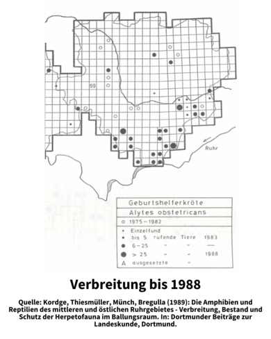 In einer Studie aus dem Jahr 1985-1988 (Kordges, Thiesmeier, Münch, Bregulla) konnte die Geburtshelferkröte in mindestens 32 Rasterfeldern nachgewiesen werden. Jonah hat diese Stude aktuell erneut untersucht und konnte nur noch an 6 Standorten in Dortmund Geburtshelferkröten nachweisen.