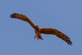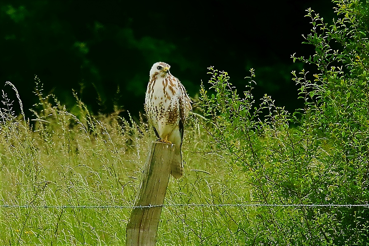 Hier ist es der allbekannte Mäusebussard der von niedriger Warte, einem Pfahl oder im Suchflug seine Beute ausspäht. Dort ein Turmfalke im Rüttelflug. Baumfalke, Wanderfalke, Sperber und Habicht sind seltene oder Zufallsbeobachtungen. Auch Rohr-, Wiesen-, oder Kornweihen zeigen sich manchmal. Zuletzt genannte überwintert hin und wieder im Ölbachtal.