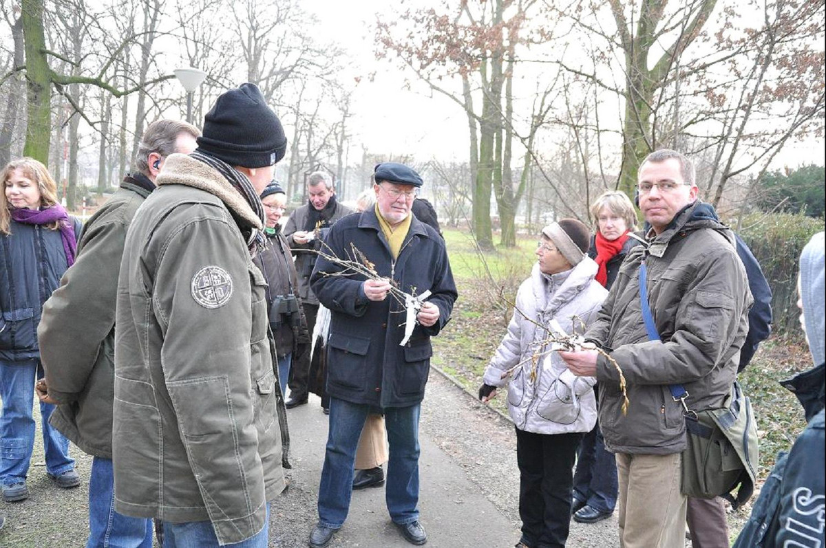 Die Sonne zeigte sich nur zaghaft zwischen den Wolken, als sich am Samstag um 10.00 Uhr über 20 Unverdrossene trotz der Kälte zu einer Gehölzexkursion im Fredenbaum trafen.