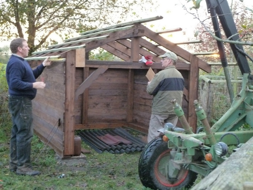 Haben mir einen Stall gebaut. (Bild 2) Vom Feineren kann ich da nur sagen. Haben auch gut geschwitzt die Jungs. Jetzt habe ich aber von einer üblen Absicht gehört. Die wollen mich doch tatsächlich, wenn meine Arbeit bei den Mädels getan ist, in ein Internierungslager stecken.
