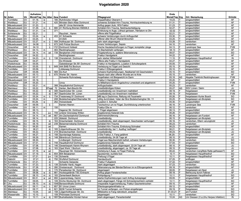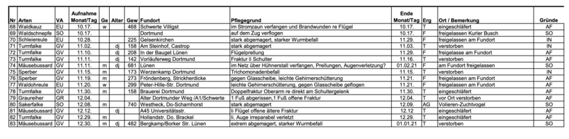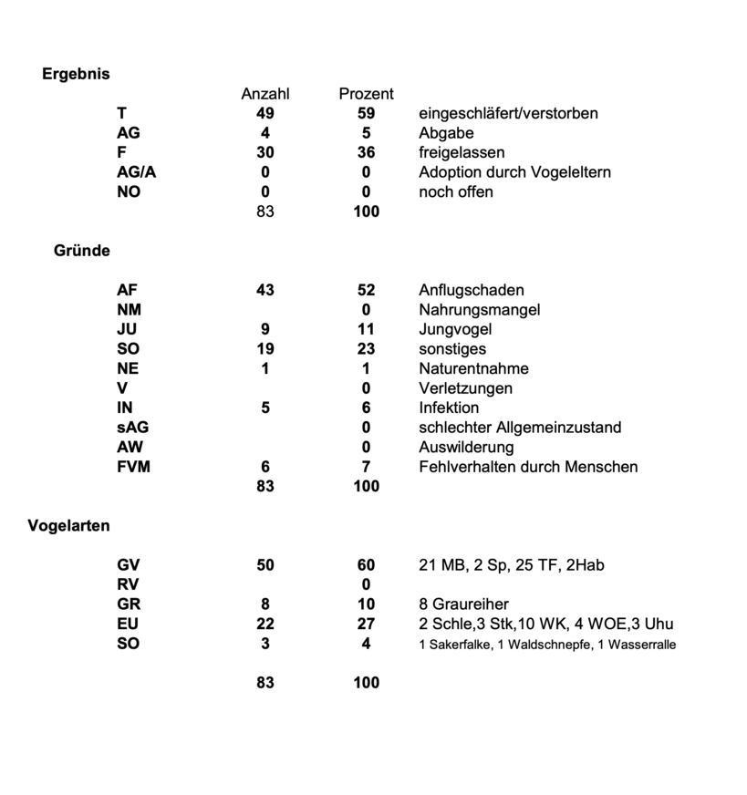 Der größte Teil der aufgenommenen Vögel, 43 Tiere, hatten Anflugverletzungen, in vielen Fällen mussten diese Tiere direkt vom Tierarzt eingeschläfert werden. Die Auswilderungsquote lag bei nur 36 %.