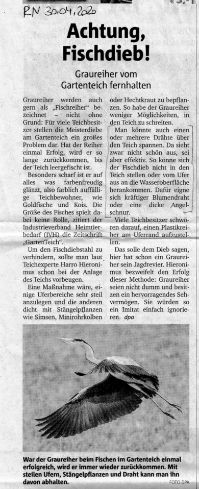 Die Rubrik Pflegegründe haben wir um einen sehr wichtigen Punkt erweitert: Fehlverhalten durch Menschen. 3 Graureiher wurden aufgenommen, weil sie sich zum Teil schwere Verletzungen in privaten Gärten zugezogen haben, der dortige Gartenteich wurde mit Angelschnüren o.ä. überspannt. Auch wenn es wieder einmal in der Tageszeitung (RN am 30.04.2020) als eine Lösung gegen ‚Fischdiebstahl‘ genannt wird, muss man ganz klar sagen, dass eine dichte Bepflanzung des Teiches oder sehr steil angelegte Uferbereiche sicherlich ein wesentlich besserer Schutz für die Fische ist.