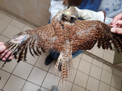 Anfang Dezember 2020 erhielten wir eine Meldung über einen Greifvogel, der sich streicheln und, ohne Handschuhe zu tragen, aufnehmen liess. Es war ein sehr abgemagerter Sakerfalke mit einem Zuchtring am Fang. Über Herrn Teicherts Mithilfe wurde der Besitzer des Vogels ausfindig gemacht. Dieser Sakerfalke ist ein reiner Zuchtvogel, der nicht falknerisch geflogen wurde und so nur das Leben in seiner Voliere kennt. Aus diesem Grund ist er in der Statisitik als ‚sonstiger Vogel‘ geführt. Unter widrigen Umständen konnte er dem Züchter entkommen, sich aber in ‚Freiheit‘ nicht selbst ernähren, so hat er dann nach fast einer Woche und ca. 50 km die Zuflucht vor einer Haustür gefunden. In dieser Zeit nahm er rund ein Viertel seines Körpergewichtes ab.