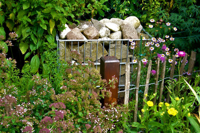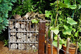 Weiterhin haben wir zwei selbstgefertigte Gambionen aus alten Zaunstabmatten (vom Schrotthändler) in mit Stauden bepflanzten Beeten an Nachbars Heckenzaun eingestellt. Eine mit einer Steinfüllung als Unterschlupf für Amphibien und Reptilien sowie als Ansitz für Vögel. Die andere mit einer Altholzfüllung ebenfalls als Unterschlupf für Insekten wie Asseln, Wanzen, Spinnen u.a. und anderen Kleintieren. Zusätzlich eine Nahrungsquelle für Kleinvögel. Beide zeigten sich schon im ersten Sommer als zweckmäßig und angepasst. Somit weitere kleine Lebensräume für Tiere und sicherlich einen Beitrag zum Artenschutz. Neben dem Gartenteich eine weitere „ Fundgrube “ für den naturliebenden Beobachter.