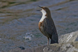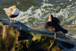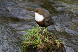Schon von Weitem sahen wir den etwas gedrungenen Vogel mit der auffallend weißen Brust, auf einem Stein im Flussbett knicksen. Auffällig waren schon einige Balzgesänge und Revieransprüche zweier männlicher Wasseramseln.
