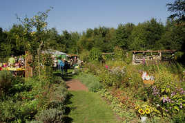 Imponierend der Stand mit der großen Pilzschau ( Foto 2 ) und die Darbietung des Falkners von der Greifvogel Station NABU Wesel mit seinen Greif - und Eulenvögeln ( Foto 3 - 4 ). Und dann natürlich der im Gelände integrierte Natur-und Bauerngarten . Für strenge Linien kein Platz.