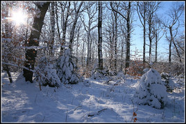 Fasziniert von der schönen Winterlandschaft stapften wir durch den hohen Schnee und wurden auch bald mit den ersten rufenden Spechten belohnt. Lautstark rief ein Buntspecht Paar und umkreiste uns in den Baumwipfeln. Einige Meter weiter konnten wir dann schon das Objekt unserer Begierde finden. Einen rufenden Mittelspecht. Er zeigte sich uns lange, wenn auch sehr hoch in den Bäumen, so das nur ein mäßiges Photo zustande kam. Und da ja bekanntlich aller guten Dinge drei sind, bekamen wir auch noch Besuch von einem Grauspecht. Dieser rief sehr lange in unsere Nähe, ließ sich aber überhaupt nicht finden.