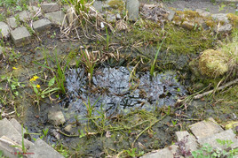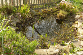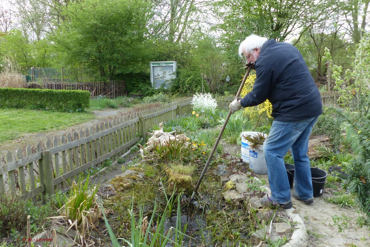 Der 2014 angelegte große Gartenteich (ca. 8 qm, an der tiefsten Stelle in der Mitte ca. 90 cm) kommt nun in das sechste Jahr. Der Pflanzenwuchs nimmt etwas Überhand und manchmal roch das Wasser auch schon etwas modrig. Jetzt Mitte April verdunstet es wieder wetterbedingt reichlich und der Wasserstand ist bis auf die zweite Steinkante abgefallen. Somit haben Klaus-Dieter und ich die Gelegenheit genutzt und gut drei Stunden lang alles restliche Wasser entnommen und gesiebt, die Tiere eingesammelt und gezählt, die Teichpflanzen (Krebsscheren, Froschlöffel, Igelkolben, Sumpfdotterblume, Fieberklee, Bach-Nelkenwurz, Wasserminze, Straußblütiger Gilbweiderich, Schlauchpflanze) etwas reduziert und den Teich mit frischem Wasser wieder aufgefüllt und die Tiere wieder eingesetzt. Da wir nur die größeren Tiere gezählt haben, ergab sich folgendes Ergebnis:
