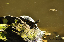 Ausgehend vom Bahnsteig Lütgendortmund-Nord folgten wir der Zollern-Route, vorbei am Dellwiger Waldteich, an dem sich auf einem Wurzelgeflecht in Ufernähe zwei ausgesetzte, amerikanische Rotwangenschildkröten sonnten.