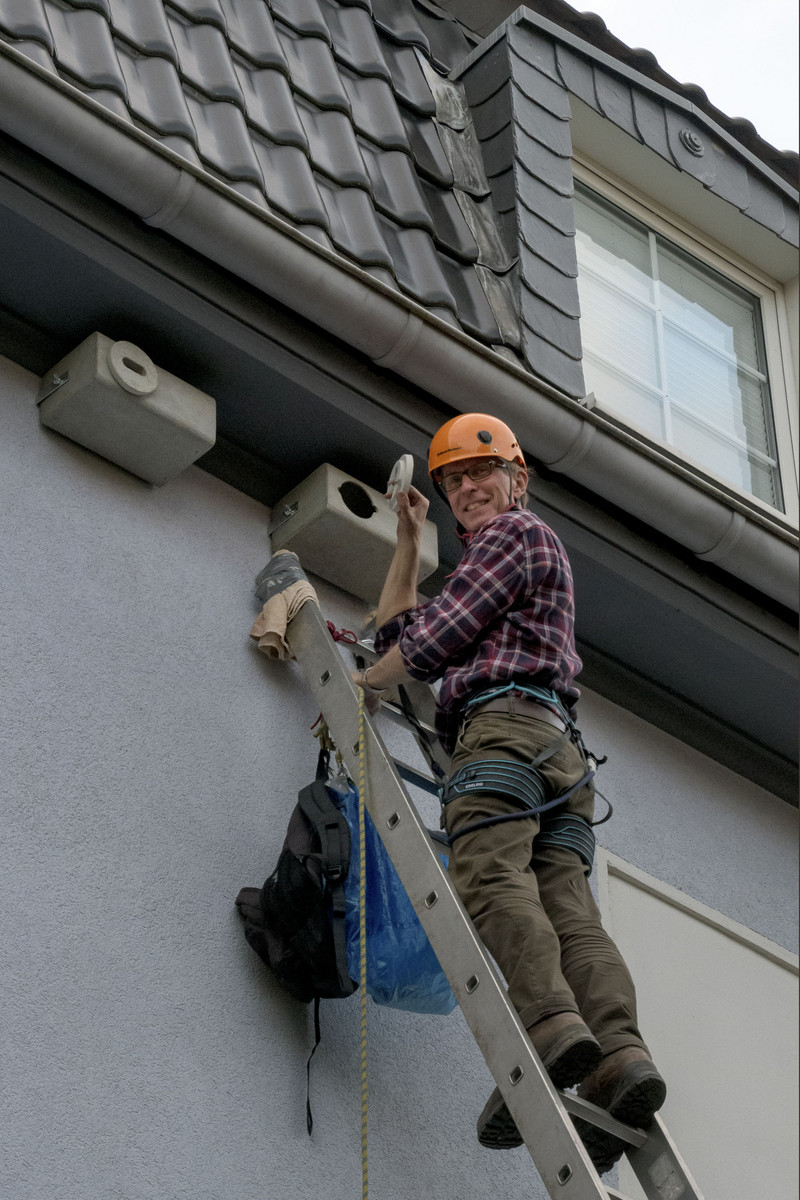 So montierten wir am 21. März 2022 in rund sechs Meter Höhe zwei Paare künstliche Mehlschwalbennester und zwei Holzbeton-Mauerseglerkästen. Das Arbeiten in dieser Höhe ist sehr zeitaufwendig. Alle Arbeitsschritte müssen zuvor am Boden sorgfältig geplant werden und oben auf der Leiter ist volle Konzentration angesagt. - Nun hoffen wir auf erfolgreiche Vergrößerung der bisherigen Mini-Kolonien.