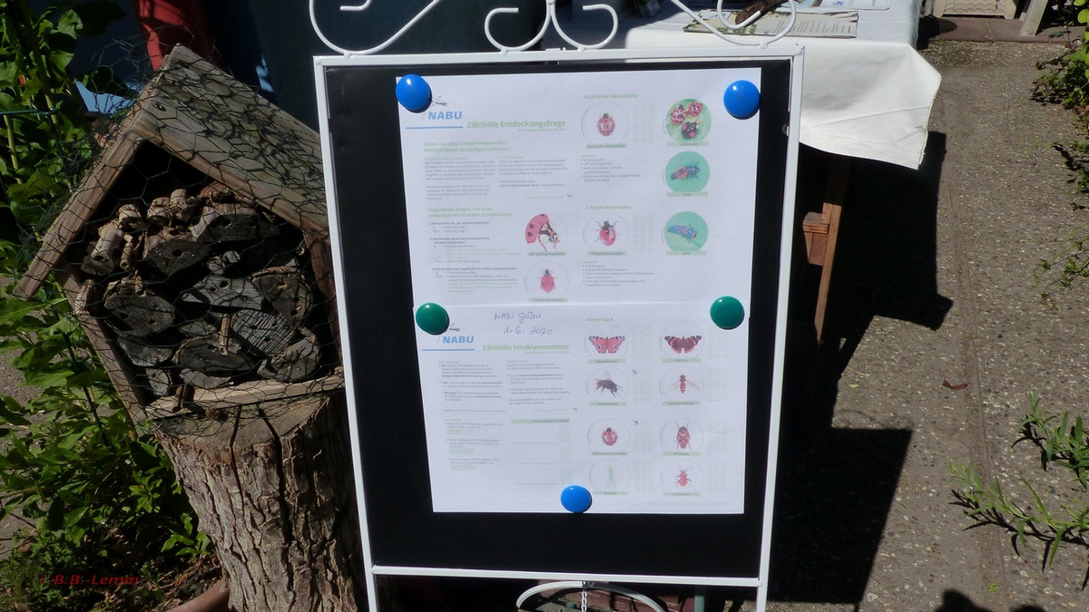 Insgesamt ergab die heutige Zählung folgende zeitgleich beobachtete Individuen. Es sind aufgrund der Unübersichtlichkeit des Gartens Mindestmengen. Schlupfwespen und Fliegen-Arten entzogen sich der Notierung aufgrund fehlender Bestimmungsliteratur.