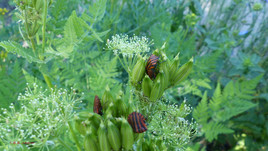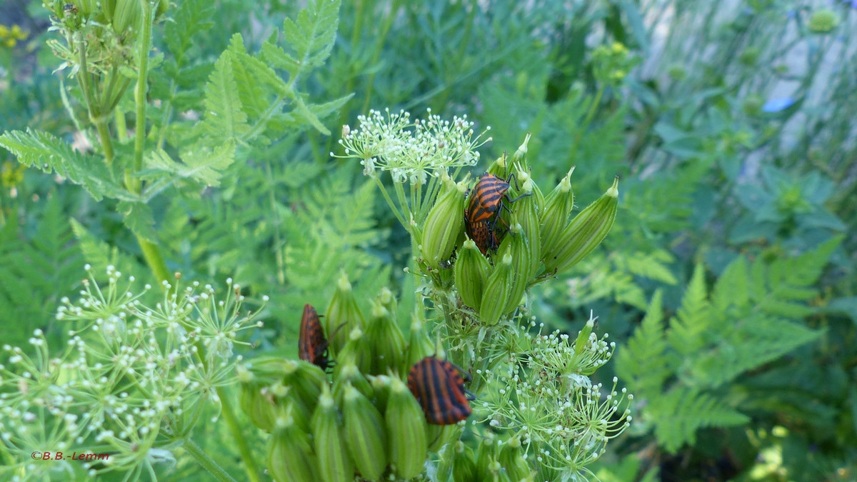 Bereits nach zwei Stunden hatte ich schon die ersten 30 Insektenarten notiert. Wobei es die Sache sicherlich erleichterte, dass ich aus Erfahrung weiß, wo sie im Allgemeinen zu finden sind. So nächtigen die Streifenwanzen gern in den Blüten und Samenständen der Süßdolden. Hier ließ sich die bestechende Anzahl von 19 ruhenden Individuen notieren. Im Jahr 2017 tauchten zum ersten Mal zwei Wanzen an einer Süßdolde im Garten auf. Vorher waren sie dort nicht ansässig.