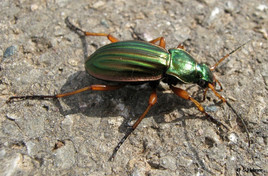 Auf dem rund 3 km langen Wanderweg durch das NSG entdeckten wir zunächst einige singende Goldammern und Bluthänflinge auf den Spitzen dorniger Hecken, bis plötzlich aus der Ferne die typischen Rufe eines Kolkraben zu hören waren. Auf dem Asphaltweg begegneten wir einem Goldlaufkäfer (Carabus auratus), einer Laufkäfer-Art von wirklich beeindruckender Schönheit und Größe.