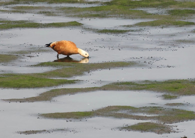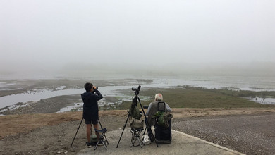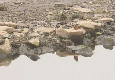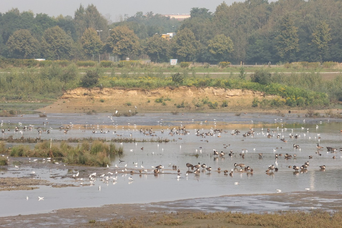 Als wir am Sonntagmorgen (3.9.) gegen zehn Uhr am HRB Ellinghausen eintrafen, stießen wir auf eine Geräuschkulisse - ein Geschrei von unzähligen Lachmöwen, dazu die Rufe unterschiedlicher Gänse, besonders schön das sonore „Gurren“ der Rostgänse. Zur Begrüßung pfiff schon mal ein Eisvogel und setzte sich in Sichtweite auf einen Stein am Einfluss der Emscher. Es herrschte noch dicker Nebel und durch den Dunst flogen immer mehr Gänse von den umliegenden Feldern ein.