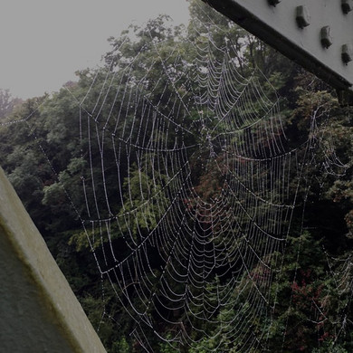 Wir stellten unser Gerät auf und versuchten, uns einen Überblick zu verschaffen, allein die Fernsicht ließ noch zu wünschen übrig und ich erfreute mich derweil an Kleinigkeiten wie den taufeuchten Spinnennetzen an einem Emscherübergang.