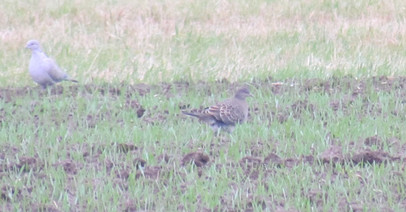 Wir teilten uns auf und unsere Gruppe suchte wie auch einige Hamburger im Dorf. Wir sahen viele Türkentauben, Buch- und Grünfinken, einen späten Hausrotschwanz aber keine Orient-Turteltaube. Nach zwei Stunden vergeblicher Suche erreichte mich ein Anruf von Michael Wimbauer, der Bescheid gab, das die Orient-Turteltaube wieder auf dem Feld zu sehen sei. Wir waren inzwischen fast wieder dort angekommen und fanden sofort einen großen Taubentrupp. Erich entdeckte dann als erster die Orient-Turteltaube in einem Baum. Der Vogel (Subsp. meena) zeigte sich für 20 Minuten von allen Seiten sitzend, fliegend und nahrungssuchend auf dem Feld. Dann flogen plötzlich alle Tauben davon.