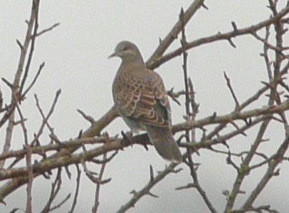 Unterwegs konnten wir erste Mäusebussarde und einen Habicht beobachten. Gegen 8 Uhr erreichten wir Wabern und trafen einen Vogelbeobachter aus Göttingen, der die Orient-Turteltaube wenige Minuten zuvor gesehen hatte. Auf einem Acker und in Apfelbäumen saßen etwa 80 Türkentauben, die aber durch einen Sperber aufgescheucht wurden und ins Dorf flogen. Zwar war eine „verdächtige Taube“ dabei, aber für eine Bestimmung reichte es nicht aus. Eine Menge Vögel waren in der Gegend unterwegs, neben vielen Türkentauben auch Wacholder- und Rotdrosseln sowie Stare in großer Zahl, auch 11 Kormorane, 5 Nilgänse und 3 Silberreiher flogen über uns hinweg.