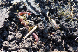 -> Bodenorganismen, Bakterien und Pilze (= Verwerter) als Konsumenten von Laub, Pflanzenresten und Exkrementen und Produzenten von aufgespaltenen Mineralien und Nährstoffen in der Humusschicht (Foto-3 Erdboden und Regenwurm)