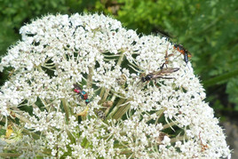 Stellen wir uns nun ein Stück Land am Waldrand, im Park, im Garten oder anderswo vor. Der Boden ist mit verschiedenen Pflanzen bedeckt. Kleine Pflanzen wie Gänseblümchen, Weißklee oder Rundblättriger Storchschnabel in der sonnenbeschienen Wiese, höhere blütenreiche Stauden im Halbschatten am Rande von blüten- und obsttragenden Gehölzen. Fluginsekten wie Hummeln, Wildbienen, Schwebfliegen, und Schmetterlinge finden sich bald ein, um Pollen und Nektar zu sammeln. Ihre Eier zur Larvenentwicklung legen sie in Erdnester, an Stauden oder im Gehölz ab. Die Larven fressen nun an ihren jeweiligen speziellen Nahrungspflanzen oder bei den Wildbienen den von den Muttertieren eingelagerten Pollen. Singvögel, Fledermäuse, Amphibien ernähren sich von Insekten (Foto 4 verschiedenen Insekten auf einer Doldenblüte). Sie fangen also entweder die Fluginsekten oder sammeln die Larven und Raupen als Futter ab. Auch viele Insektenarten wie Wespen und Hornissen und auch die verschiedenen Spinnenarten sind Jäger und ernähren sich von anderen Insekten.