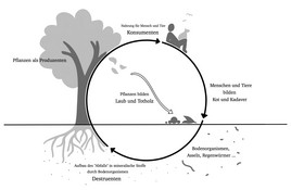 -> Tiere und Menschen als Verbraucher dieser Produkte und Produzenten von Exkrementen und Kohlenstoff durch Atmung