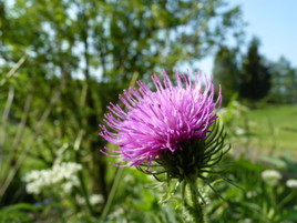 Bei kleinen Gesprächen rund um das Hobby Natur- und Vogelbeobachtung gelangten wir schnell ins eigentliche Wannebachtal, wo es zum ersten Mal anfing leicht zu regnen, was uns aber wenig gestört hat. Wir erreichten ein idyllisch gelegenes Haus, auf dessen Dach ein prächtiges Hausrotschwanz-Männchen sang. Gleichzeitig entdeckten wir einige Stare und zwei Exemplare der farbenprächtigen Stieglitze, die zutraulich in einigen Metern Entfernung in der Wildblumenwiese nach Samen suchten. Bachstelzen flogen umher, wobei eine sogar ihren Gesang präsentierte. Eine Schönheit anderer Art stellte ein Taubenschwänzchen dar, das an uns vorbeiflog.