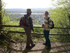 Auf eine Empfehlung zweier Ornithologen hin beschlossen wir, mit dem Zug ein paar Stationen zu fahren und uns die beeindruckenden Basaltwände der Rabenlay anzuschauen, in denen sich stets der Uhu aufhalten soll. Einige von uns nahmen den langen, steilen Weg auf sich, um die vielseitigen Möglichkeiten zum Blick auf die Felswände des Steinbruches zu nutzen. Wir imitierten den Ruf des Uhus und lauschten, plötzlich erhielten wir eine Antwort. Ein Uhu saß definitiv in der Steilwand, jedoch verdeckte dichte Vegetation die Sicht auf den Rest der Basaltwand. Auf der Suche nach dem Uhu belohnte uns, ganz oben angekommen, schließlich ein atemberaubender Blick über den Rhein. Leider zeigte sich der Uhu nicht mehr und so machten wir uns auf den Rückweg, welcher noch eine Überraschung bereit hielt. Im schönen Ort Bonn-Oberkassel überflogen uns mehrere Halsbandsittiche mit lautstarken Rufen. Ein schöner und bunter Abschluss unserer Tagestour.