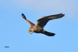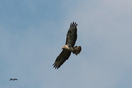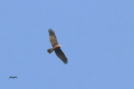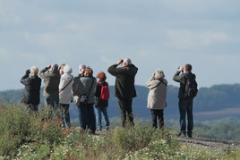 Als dann anschließend größtenteils die Wolkendecke auflockerte , die Sonne und ein schöner Blauhimmel sich zeigte , waren die nächsten drei Stunden für die Beobachtung ziehender Greifvögel im Luftraum perfekt. Zuerst nicht zu übersehen, eine über die teilnehmenden Beobachter hoch nach Südwesten ziehende Rohrweihe. Alsbald erfolgte dann auch der vorgesehene Aufstieg auf den Deusenberg. Dort - fast in Augenhöhe , sahen die gespannt wartenden Exkursionsteilnehmer mehrere ziehende Mäusebussarde und einen Rotmilan.