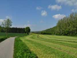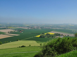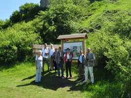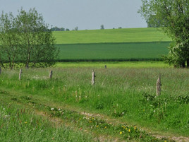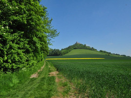 Angekommen - hat die Sonne hier die letzten Dunstschleier aufgesogen und ein schöner Tag zeigt sich.Über einen steilen Feldweg,vorbei an grünen Feldern und blumenbunten Wiesen mit Feldlerchen und Wiesenstelzen geht es aufwärts zur Burgruine.