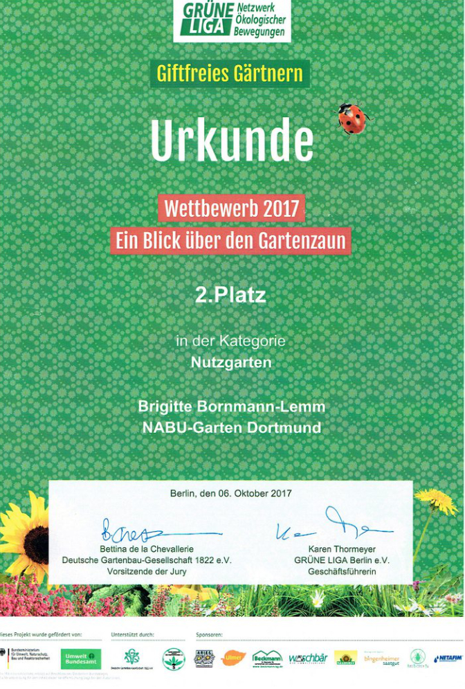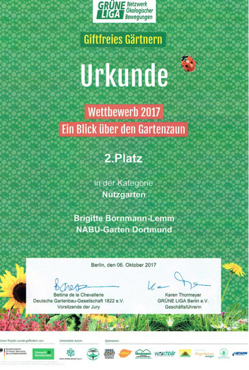Ein halbes Jahr hatte die GRÜNE LIGA Berlin mit ihrem Gartenwettbewerb „Ein Blick über den Gartenzaun“ bundesweit nach den schönsten naturnahen Gärten gesucht. Mitmachen konnten grüne Oasen, die ökologisch und gänzlich ohne den Einsatz von chemisch-synthetischen Pflanzenschutzmitteln und Düngern gestaltet und gepflegt werden. Am 06.10.2017 fand die Auszeichnung von zahlreichen Gartenprojekten im Haus der Land- und Ernährungswirtschaft in Berlin statt. Der zweite Platz in der Kategorie Nutzgarten ging an den NABU-Garten Dortmund. Unter dem Motto „Natur gestalten - Natur erleben“ vermittelt der NABU-Naturgarten mit Führungen und Gartenveranstaltungen allen Interessierten und auch den örtlichen Gartenfachberater wie ökologisches Kleingärtnern gelingt.