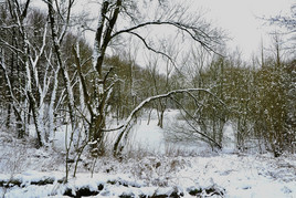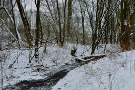 Um Wintervögel zu beobachten, hat es mich stets an Wintertagen in das untere Ölbachtal gezogen. Dort wo der Ölbach an der Stadtgrenze zu Bochum den Harpener Hellweg unterquert, machte ich wieder den Einstieg in das etwas unwegsame und wenig begangene Teilgebiet nahe dem Berghofer Holz. Erstaunlicherweise bleibt hier in der Talniederung der Schnee teilweise etwas länger liegen. Nebenbei bemerkt: Entlang dem zwar kurzen aber holperigen Weg ins Gelände, machte sich langsam der Rucksack mit Kamera und angesetztem Teleobjektiv auf dem Rücken bemerkbar. Doch Neugier und Fotoergeiz ließen die vorgenannte Bemerkung wieder einmal vergessen.