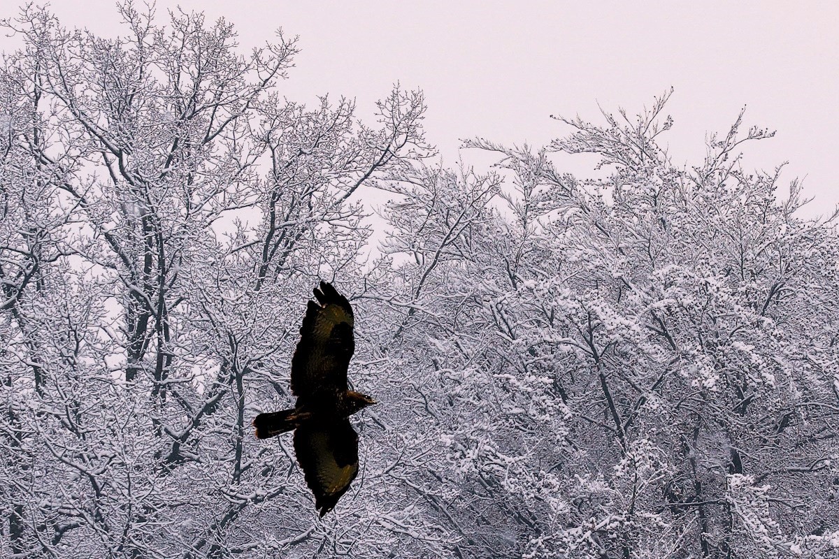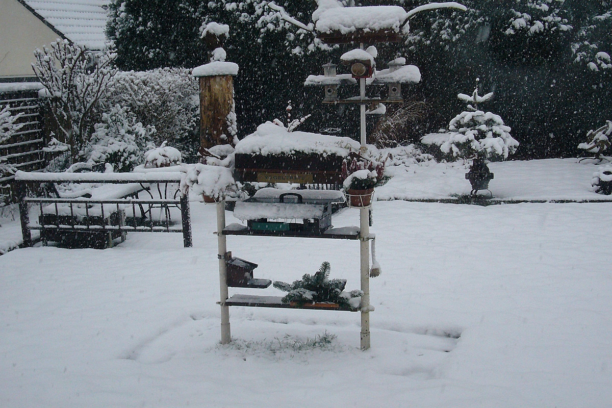 Tags darauf bedeckten winterlich dicke Schneeklumpen die starren Äste der Bäume des nahen Waldes, vor deren Kulisse sich ein wohl hungrig abstreichender Mäusebussard mehrmals zeigte. Auch unser Garten war reichlich zugeschneit. Lange vermisste Winterbilder, welche aber im Laufe einer knappen Woche nach frostigen, nebligen und regnerischen Tagen durch ein Tau-und Matschwetter abgelöst wurden.