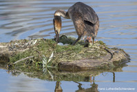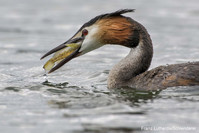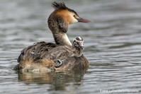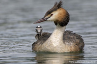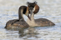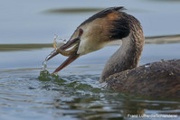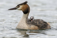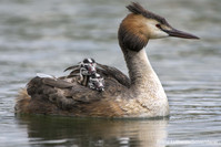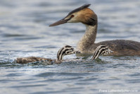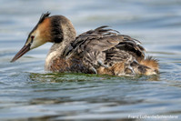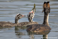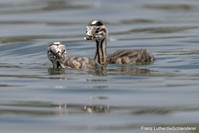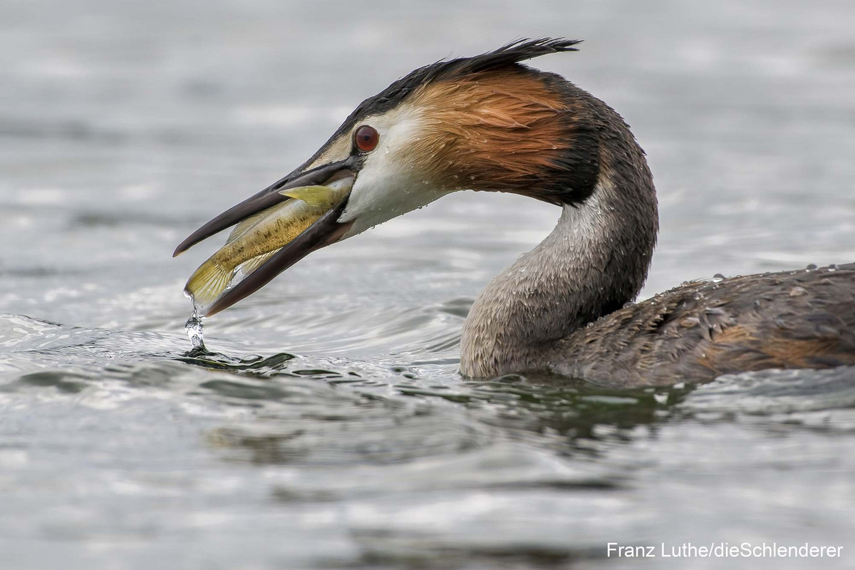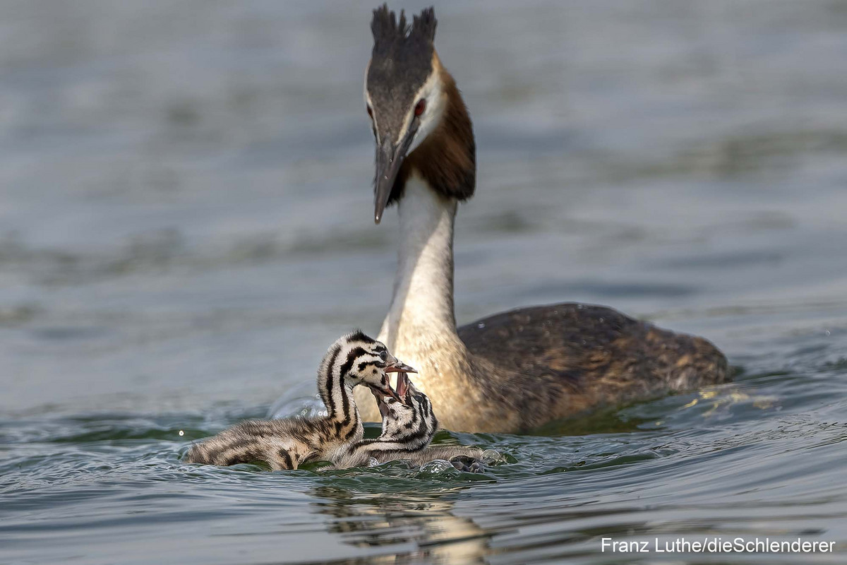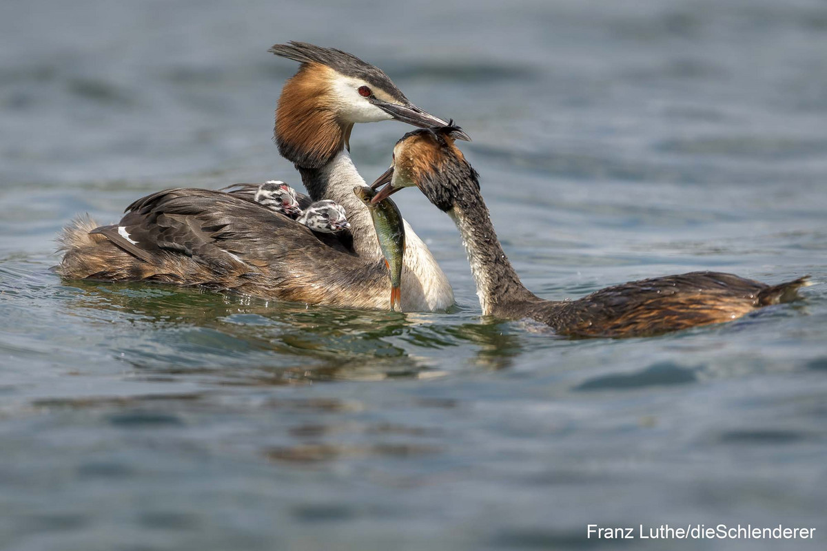 Das Haubentaucherpaar, das ich fotografiere, hält sich ziemlich nahe am Südufer des Phoenixsees zwischen dem zweiten und dritten Ponton Richtung Osten auf und ist deshalb recht gut zu beobachten. Die Eltern kümmern sich hingebungsvoll um ihre zwei überlebenden Küken. Immer wieder taucht entweder das Weibchen oder das Männchen nach kleinen Fischen oder fängt Insekten an der Wasseroberfläche. Dann schwimmt es mit kräftigen Zügen zu seiner Partnerin, auf deren Rücken es sich die beiden Jungtiere noch immer gemütlich machen. Die Fische sind klein genug, sodass sie problemlos von den Küken hinuntergeschluckt werden können. Die größeren Fänge werden von den Eltern selber vertilgt. Zwischendurch werden kleine Daunenfedern verabreicht, sie sollen die empfindliche Schleimhaut im Magen der Kleinen gegen die scharfkantigen Fischgräten schützen.