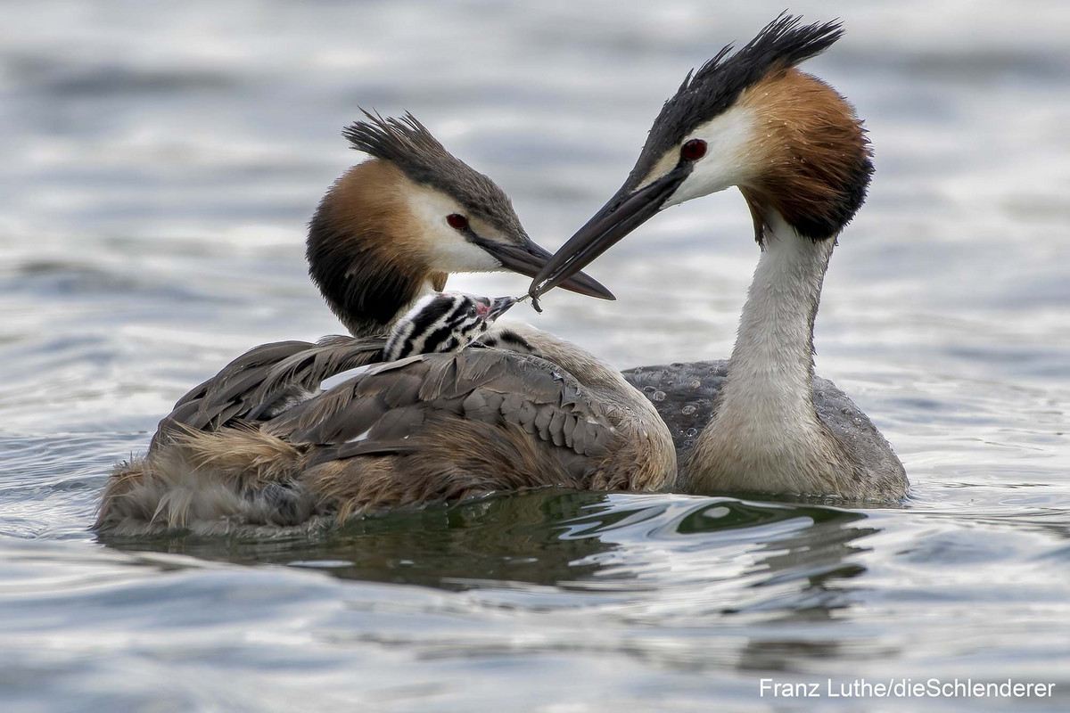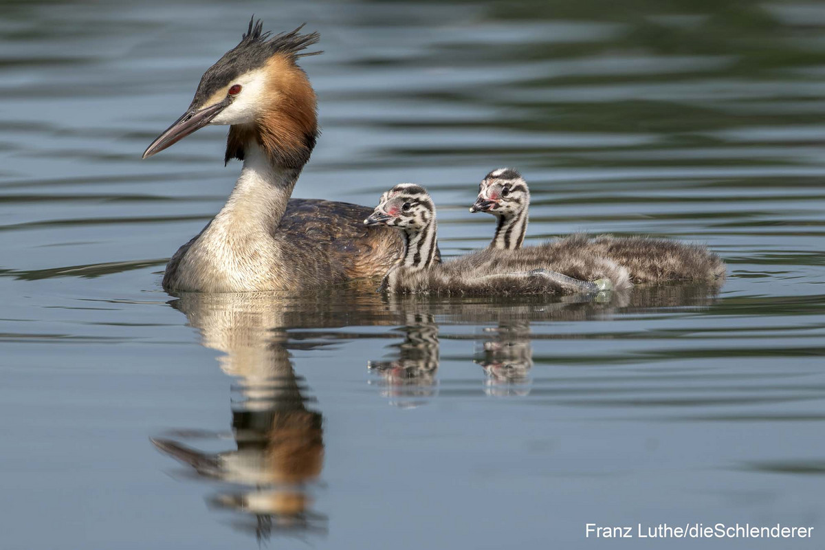 Eine Haubentaucherfamilie auf dem Phoenixsee