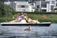 Die Haubentaucher haben es auf dem Phoenixsee nicht wirklich leicht. Am Sonntag, 27. Juni, waren es noch drei Küken auf dem Rücken von Mama oder Papa. Am Freitag, 2. Juli, sind es nur noch zwei, die von den Alttieren gefüttert werden. Wie mir ein Videofilmer, der schon seit zwei Wochen das Paar mit ihren Küken begleitet, erzählt, baut ein anderes Haubentaucherpaar gerade zum dritten Mal an ihrem Nest am Ufer der Kulturinsel. Die beiden ersten Aufzuchten haben leider nicht überlebt und jetzt ist wohl ein weiteres Gelege geplant.