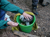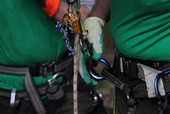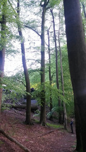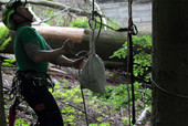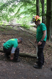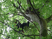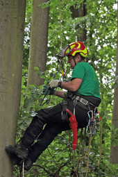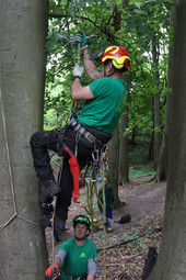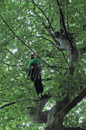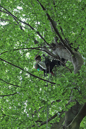 Zehn Tage später meinte Herr Teichert, es werde Zeit, den Vogel ins Nest zurück zu setzen. Allerdings befand sich das Nest in rund 20 Metern Höhe in einer Buche, so dass zunächst ein Baumkletterer gefunden werden musste, der den Rücktransport übernehmen konnte. Durch einen Tipp unserer Landschaftsgärtners nahmen wir Kontakt zu dessen Kollegen John Higgins, einem Neuseeländer, auf. Dieser war auch sofort bereit, die Aufgabe gemeinsam mit Peer Stockhausen zu übernehmen.