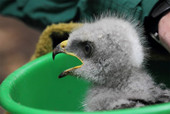 Lautstark forderte das graue Federbündel dort sein Futter und ein und legte so schnell an Gewicht zu. Innerhalb von vier Tagen hatte sich das Gewicht von zunächst 128 Gramm mehr als verdoppelt, der Vogel brachte jetzt 262 Gramm auf die Waage. Allerdings konnte er zunächst nicht ins Nest zurückgesetzt werden, weil ein Auge entzündet war und mit Augentropfen behandelt werden musste. Möglicherweise war dies sogar der Grund, warum der Jungvogel aus dem Nest geworfen wurde.
