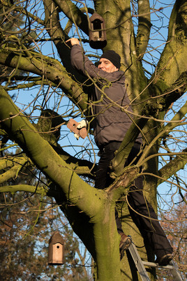 Der NABU Dortmund hat im Dortmunder Zoo schon vor vielen Jahren Nistkästen aufgehängt. Mittlerweile ist Ihr Zahl auf ca. 100 Kästen angestiegen. Darunter Kästen für Baumläufer, Hohltaube, Schnäpper und Meisenkästen. Heute haben wir, Neil und Brigitte Handy, die jährlich anfallende Reinigung erledigt. Auch wenn es eine nicht zu unterschätzende Arbeit ist, Leiter rauf....Leiter runter, macht es immer großen Spaß. Kommt man doch auch mal hinter die Kulissen der Gehege und bekommt so ganz andere Eindrücke. Sehr gerne würden wir zu dieser Aktion auch jemanden mitnehmen die sich vorstellen könnten diese Arbeit auch mal selbstständig zu übernehmen. Bei Interesse meldet euch bitte bei Brigitte Handy.